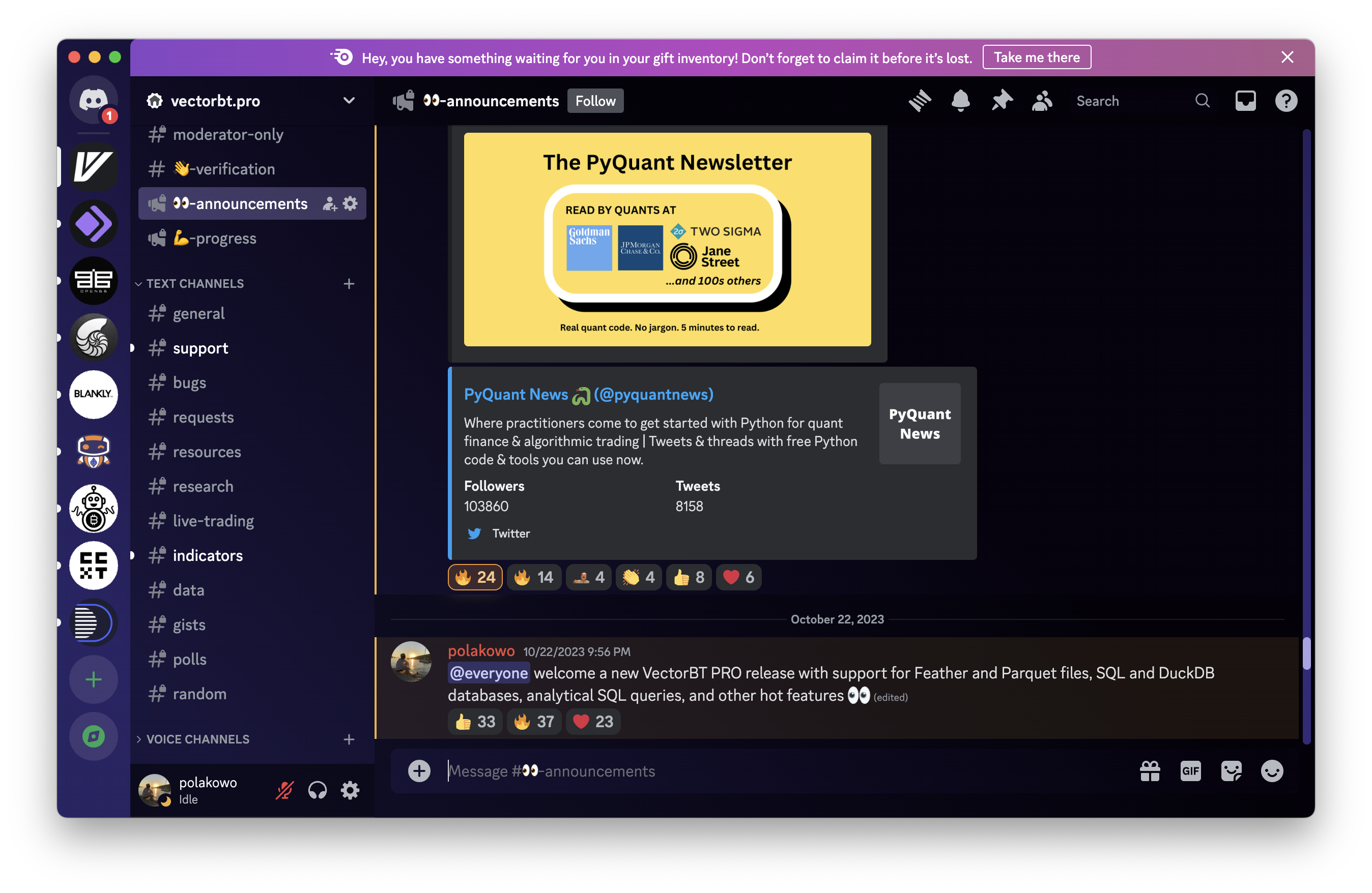 By subscribing to VBT, you gain immediate access to exclusive features, priority updates, and a private GitHub repository. You will join a thriving community of quants on Discord for direct support and collaboration. Subscribers also unlock in-depth tutorials, hands-on examples, and tools for high-performance backtesting and research.
